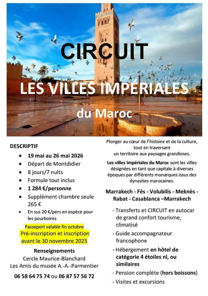Transfert en autocar depuis Montdidier vers l’aéroport de Paris. A l’arrive, formalités d’enregistrement et envol à destination de Marrakech. Accueil à l’arrivée par notre représentant local, puis transfert à votre hôtel. Installation dans les chambres. Dîner et nuit à l’hôtel.
